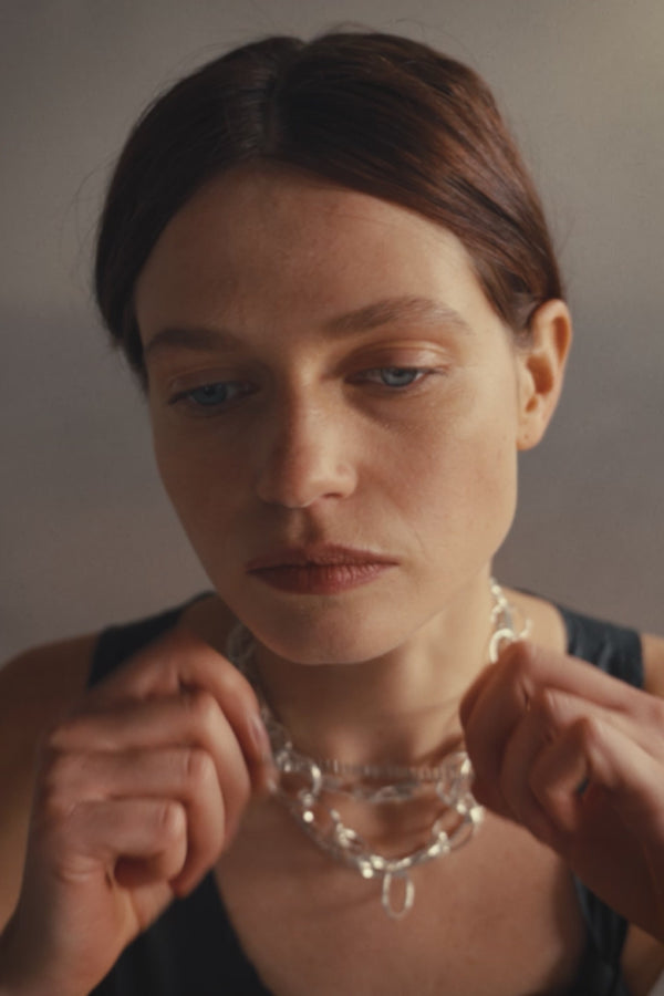 Softly structured and endlessly versatile. The double curve design flows around the neck with quiet sophistication — refined minimalism in motion.